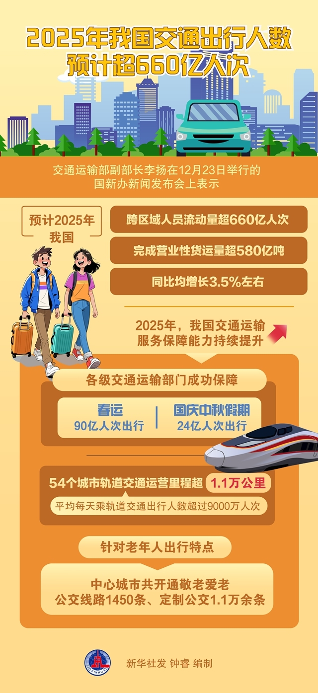 交通運(yùn)輸部副部長(zhǎng)李揚(yáng)在12月23日舉行的國(guó)新辦新聞發(fā)布會(huì)上表示,預(yù)計(jì)今年我國(guó)跨區(qū)域人員流動(dòng)量超660億人次,完成營(yíng)業(yè)性貨運(yùn)量超580億噸,同比均增長(zhǎng)3.5%左右。