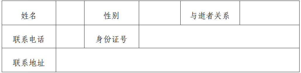 逝者未重復(fù)享受機(jī)關(guān)事業(yè)單位、基本養(yǎng)老保險(xiǎn)、工傷保險(xiǎn)、失業(yè)保險(xiǎn)等喪葬補(bǔ)貼。如有不實(shí),自愿退回補(bǔ)貼資金并承擔(dān)法律責(zé)任。